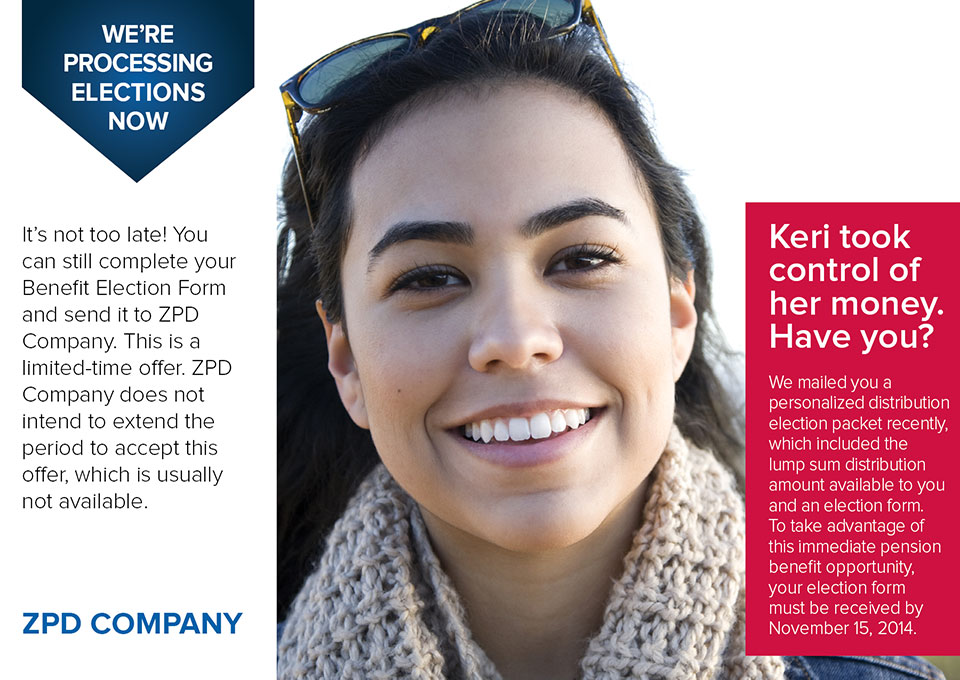 The purpose of having a communication campaign is to simplify the message through multiple touch-points. Don’t expect one mass mailing to do the job. Instead, announce the window, educate about the opportunity, and provide reminders about the deadline. Lastly, send postcards confirming receipt and acceptance of paperwork once participant elections are confirmed. Below is an outline of communication elements to keep the message front and center for participants.